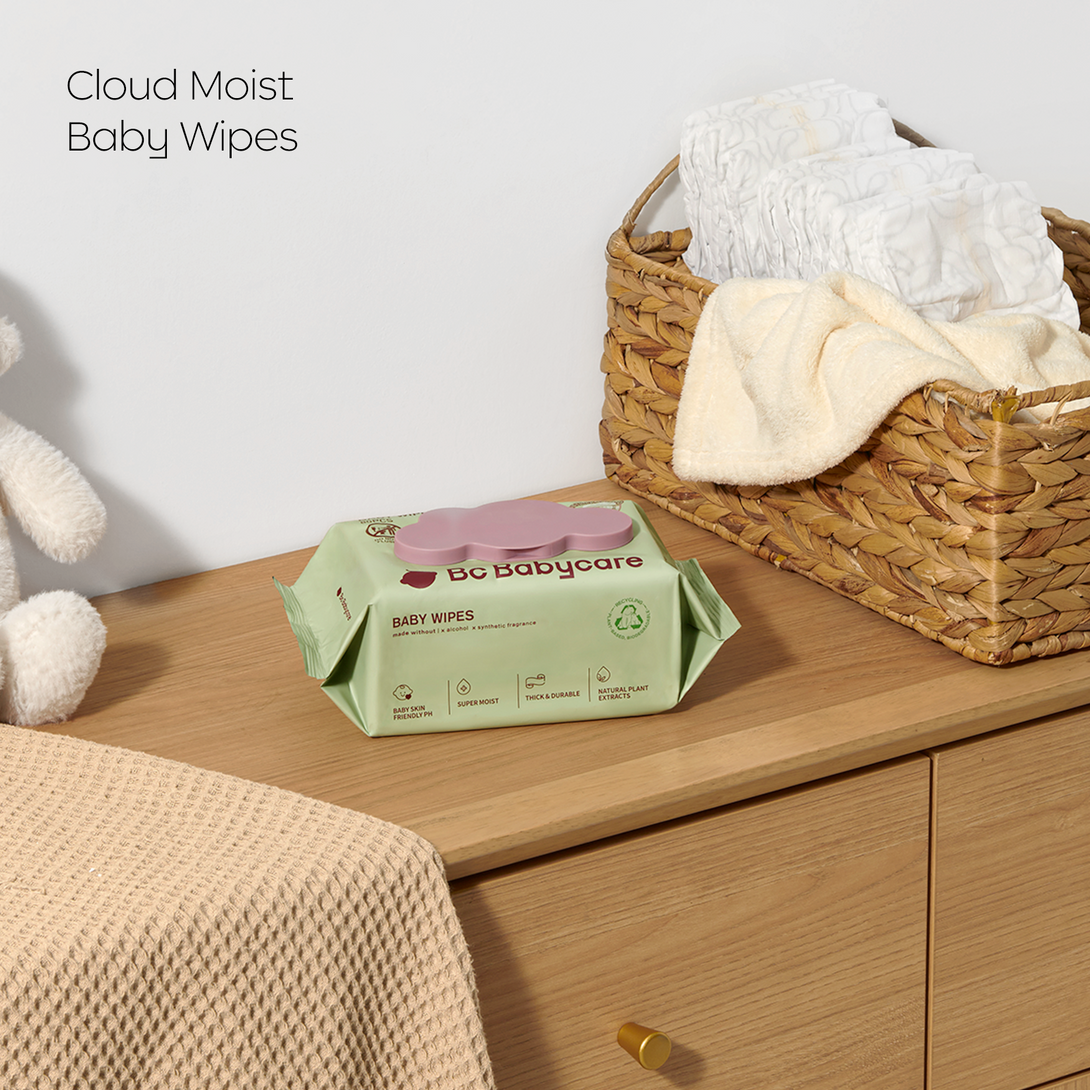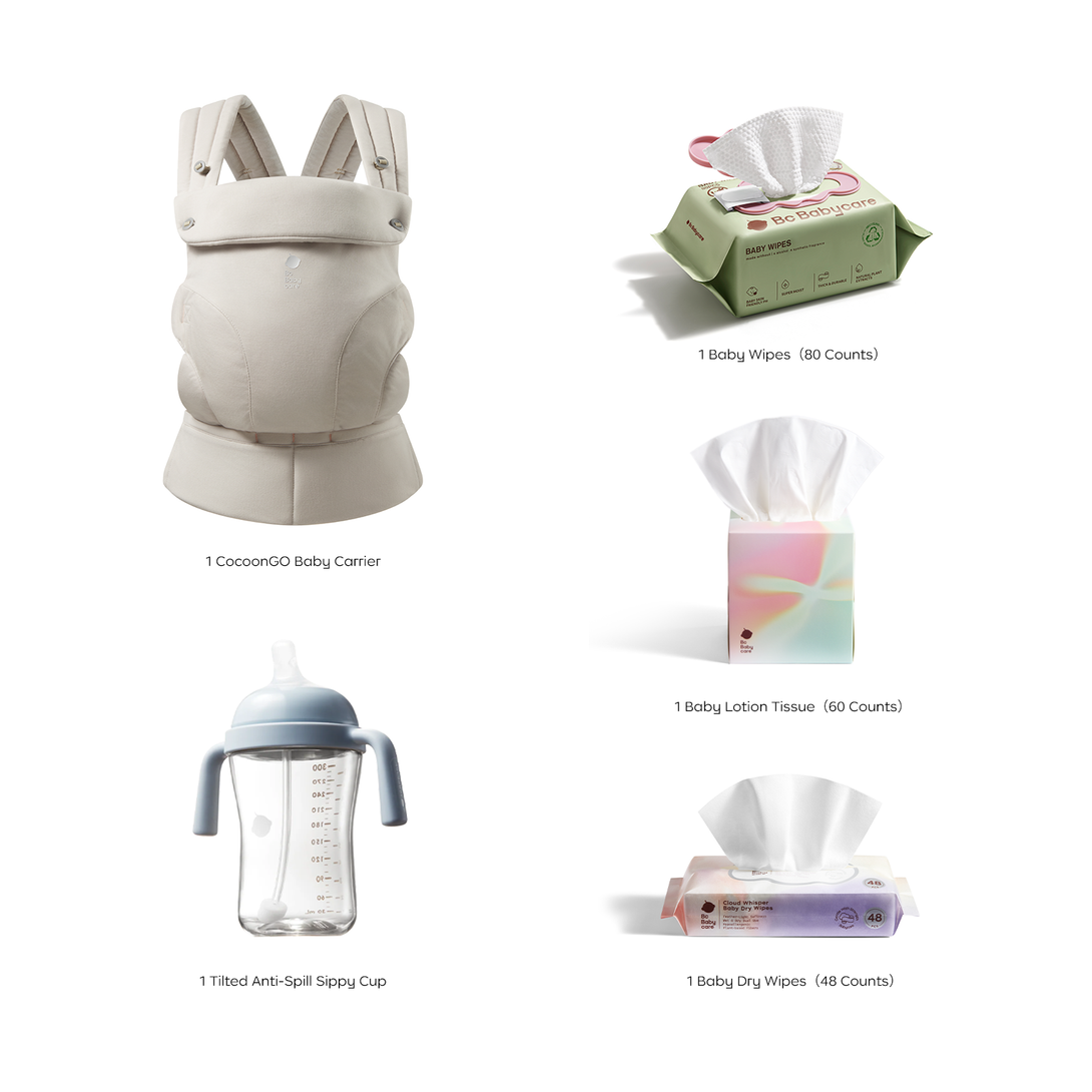 The BC Babycare Baby Gift Box includes the Cocoongo Baby Carrier, Tilted Anti-Spill Sippy Cup, Cloud Moist Baby Wipes (80 counts), Cloud Touch Baby Lotion Tissue (60 counts), and Cloud Whisper Baby Dry Wipes (48 counts), providing a comprehensive set of essential baby care products.