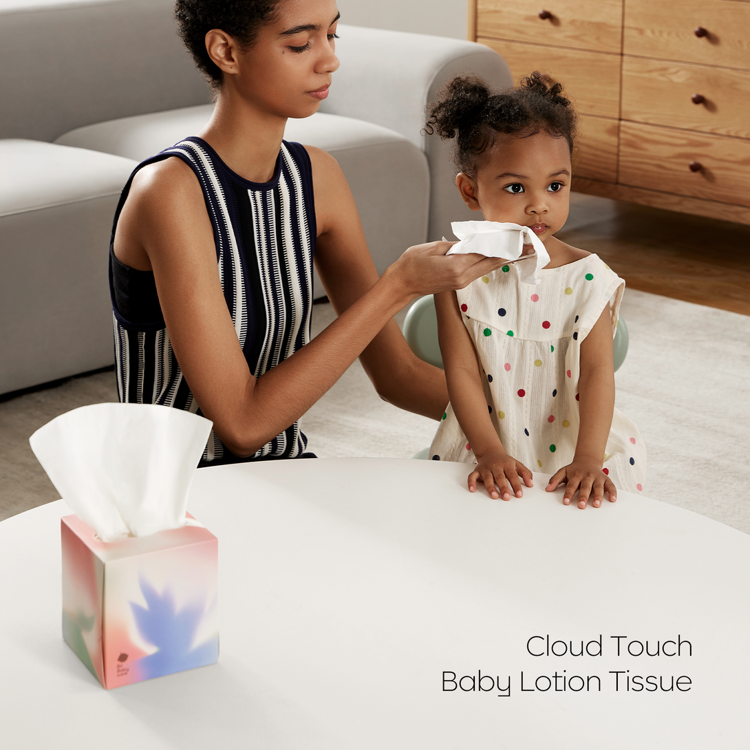 Ultra-soft 5-ply tissue infused with lotion for nose, mouth, and hands.