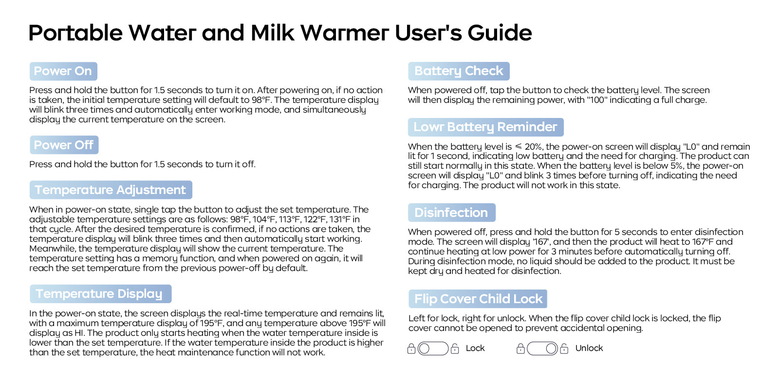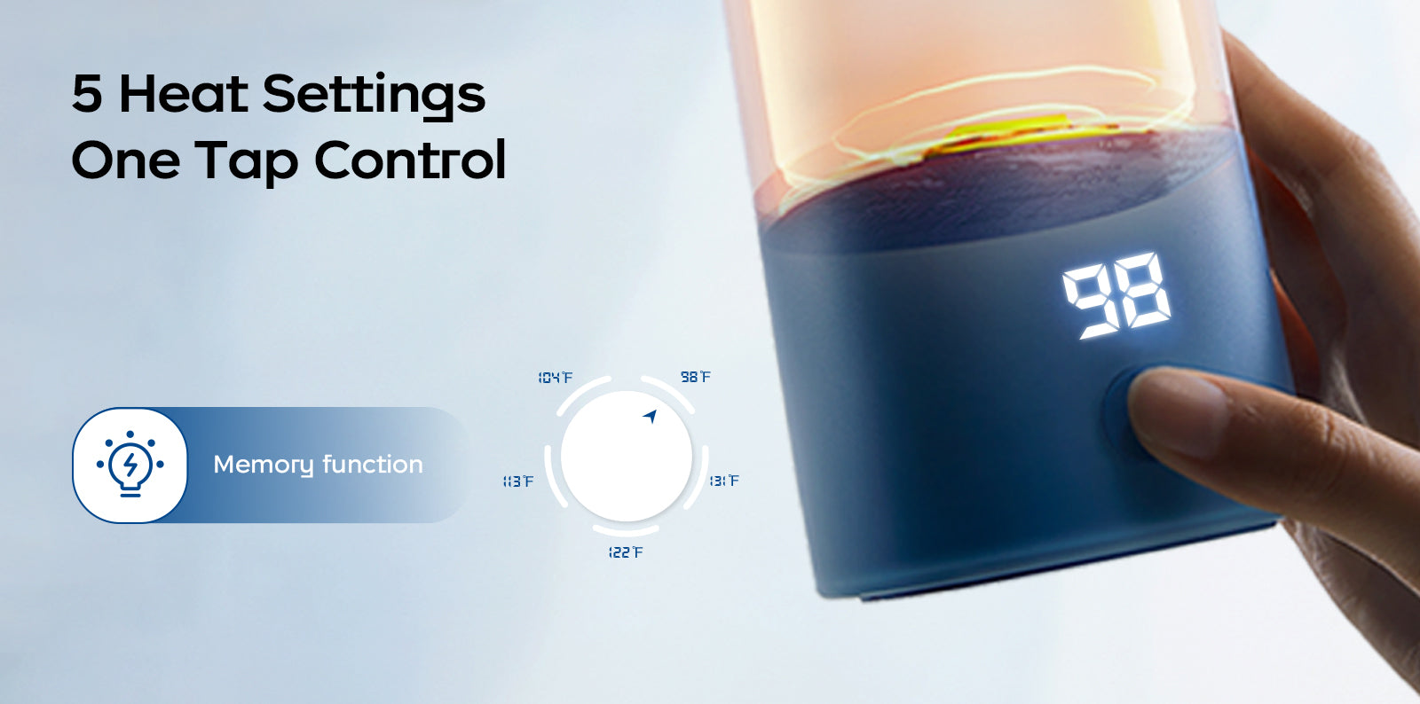 - Precise Temperature Control: Accurately detects liquid temperature for better warming. 5 temperature settings (98°F、104°F、131°F、122°F、131°F) meet different feeding needs.