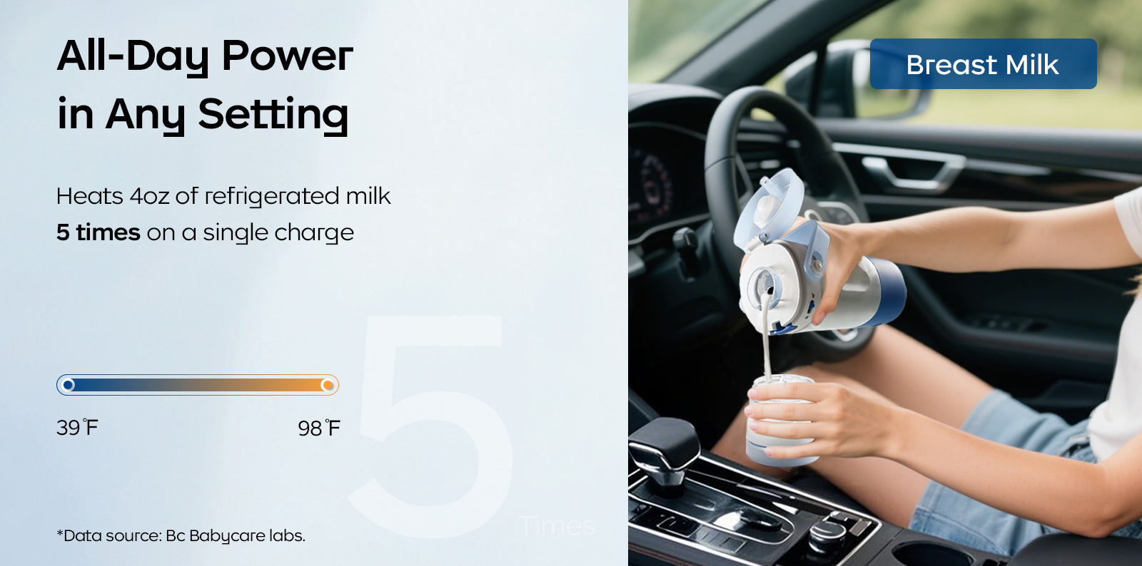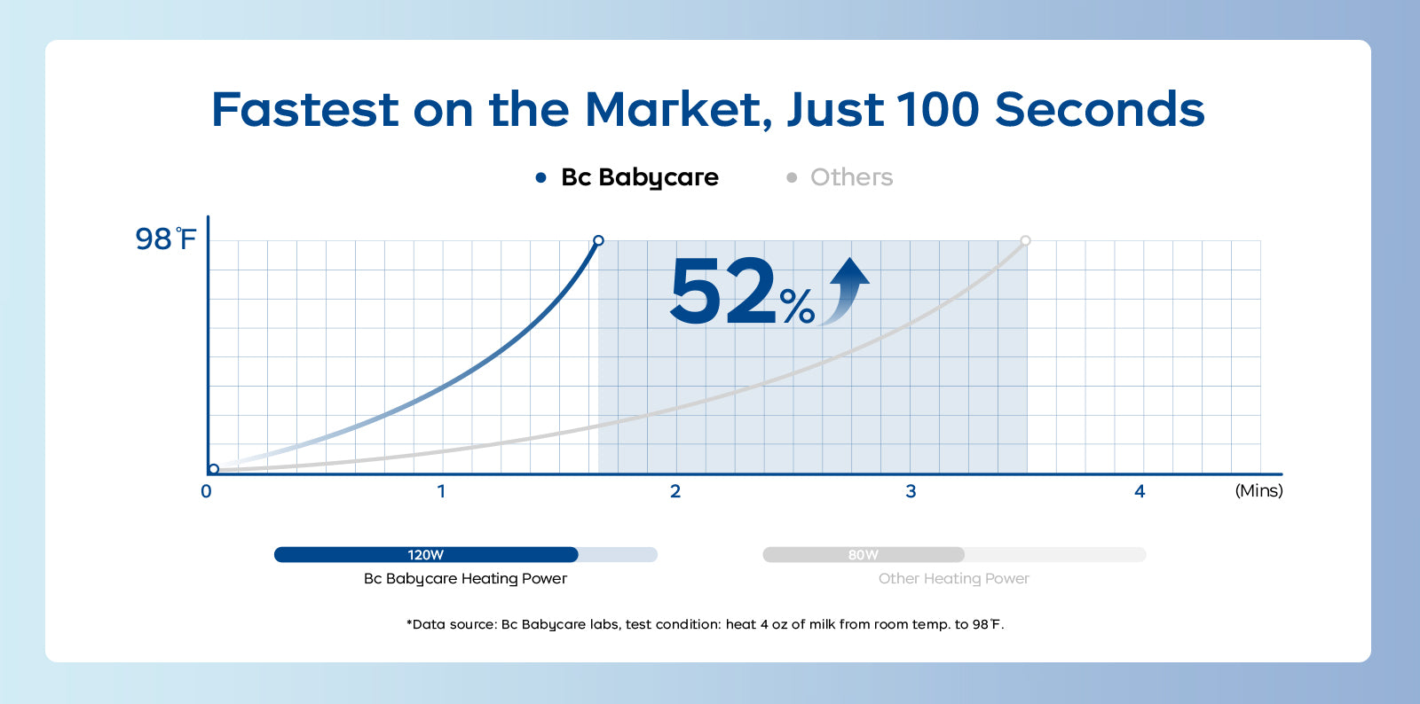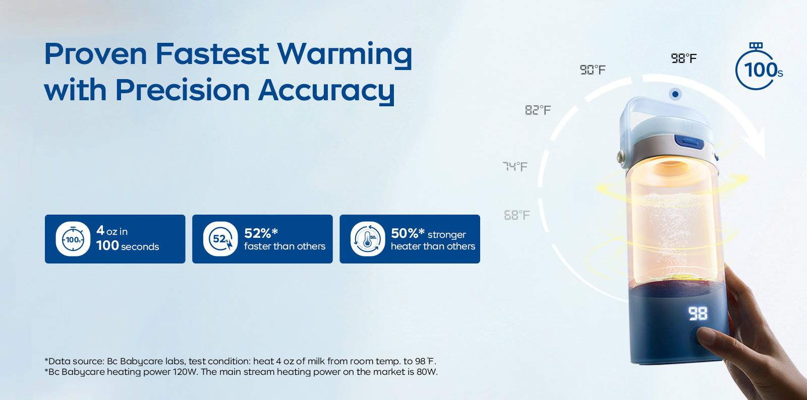 It only takes 100 seconds to heat 4 oz of milk at room temp. to 98°F, which is a suitable temperature for feeding.