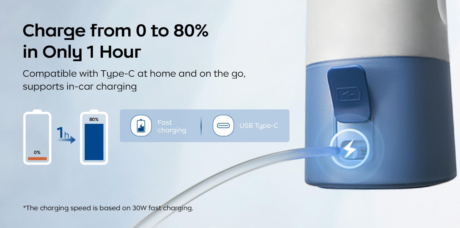 Charge from 0 to 80% in just 1 hour and fully charge in 1.5 hours. It can be charged using Type-C at home and it also supports in-car charging. The charging speed is based on 30W fast charging.