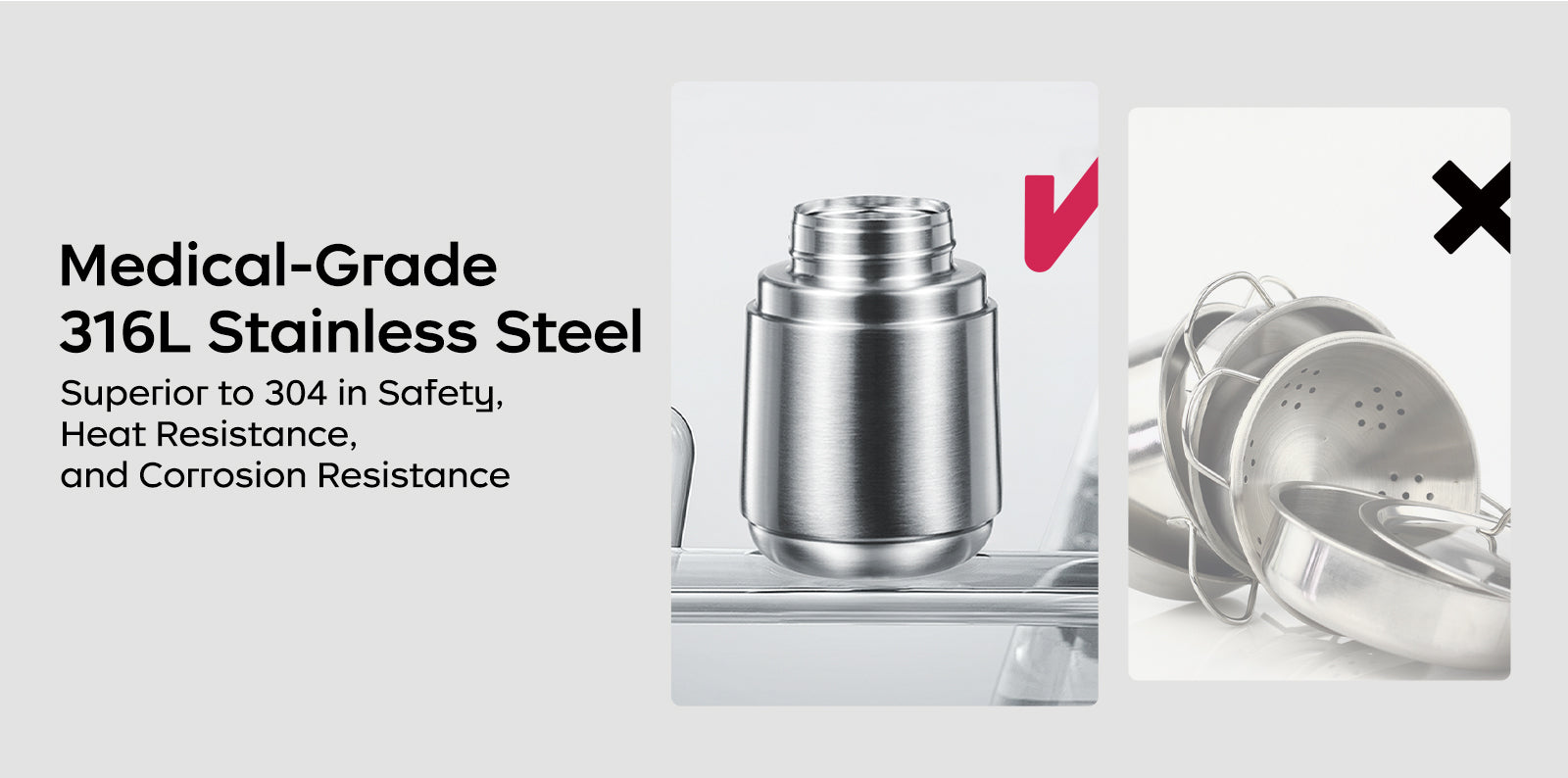 - Medical-Grade 316L Stainless Steel: Offers superior heat resistance and corrosion protection compared to standard 304 stainless steel.